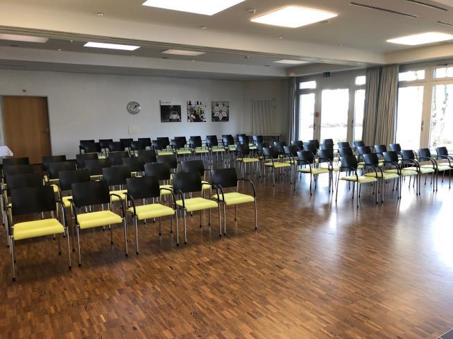 Unser lichtdurchfluteter Saal bietet mit seinen ca. 150 m2 Platz für bis zu 80 Personen und ist sowohl für Seminare, Vorträge, Generalversammlungen sowie private oder geschäftliche Anlässe geeignet.