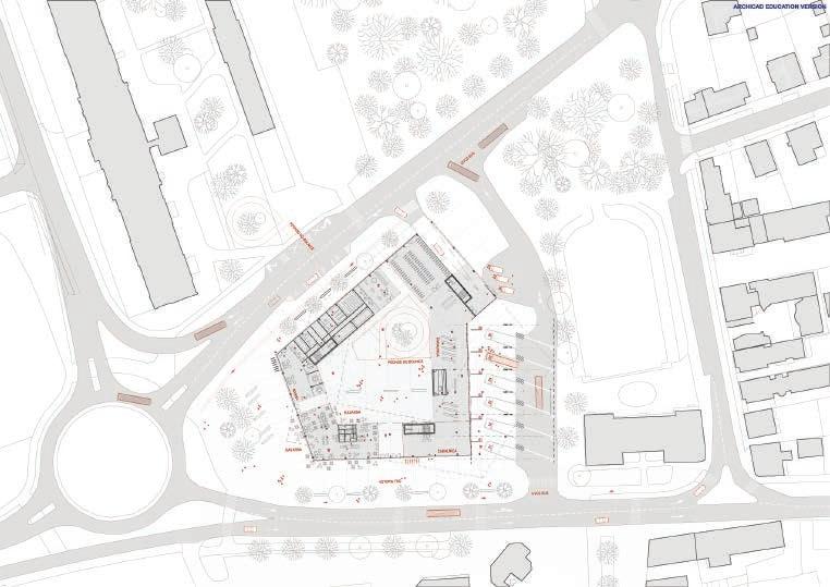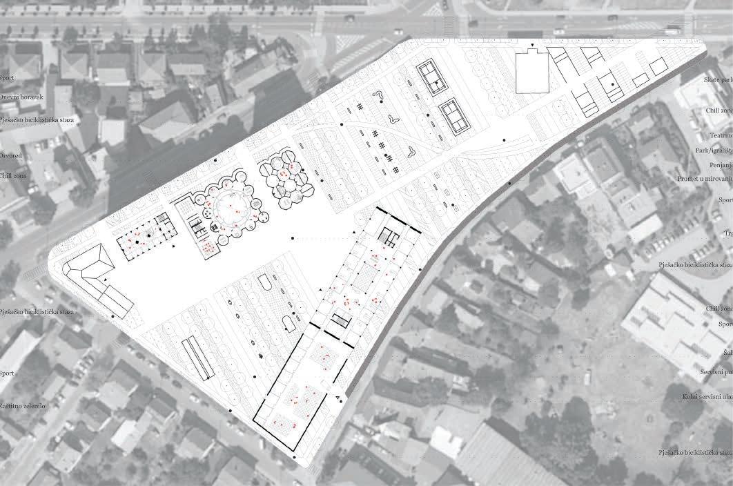 Objekti su dinamično smješteni, prilagođeni postojećoj urbanoj strukturi. Prioritet imaju pješaci i biciklisti, promet je smanjen, a jugozapadna cesta ukinuta. Tržnica i buvljak ostaju otvoreni, s dodatnim nadstrešnicama koje naglašavaju povezanost područja s tržnicom.
