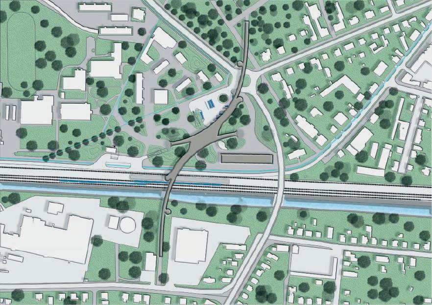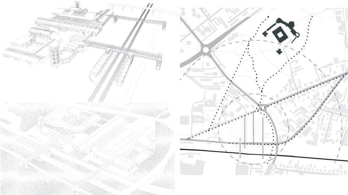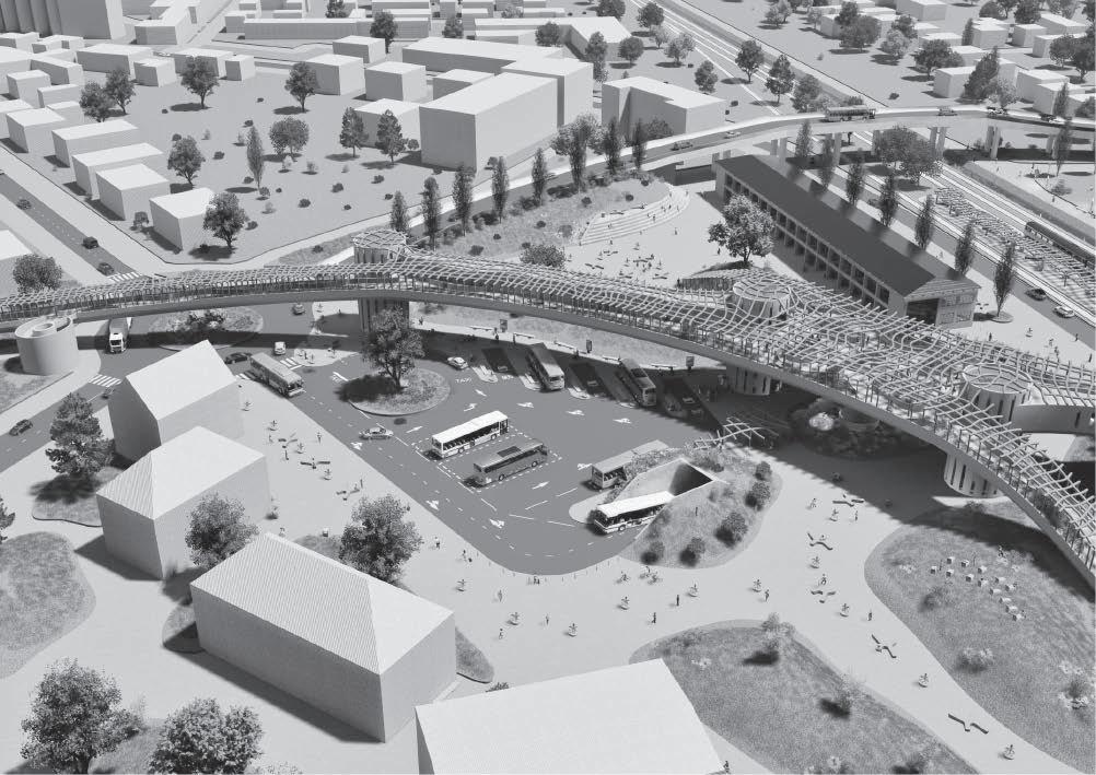 Projekt se fokusira na novi željeznički kolodvor na sjevernoj strani lokacije, koji funkcionira kao suvremeno infrastrukturno čvorište. Objedinjuje cestovne, željezničke i pješačke komunikacije, omogućujući učinkovitu mobilnost i privlačeći različite oblike prometa.