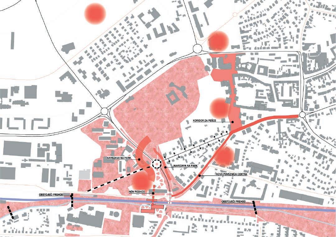 Podzemna os povezuje ključne točke: Stari hrast, željeznički kolodvor i poduzetnički inkubator s garažom. Dva nova javna trga omogućuju bolju pristupačnost i povezivanje gradskih područja.