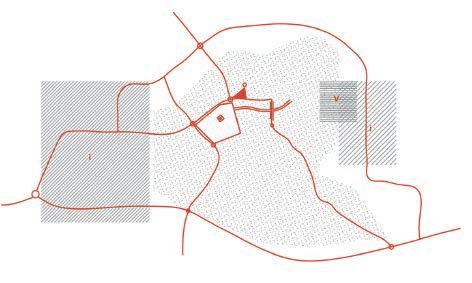 Na sjeveru se ističe novi željeznički kolodvor, dok se na jugu nalazi trgovačko-poslovni objekt koji služi južnom dijelu grada i funkcionira kao orijentacijska točka. Njegov strateški položaj usmjerava gradske tokove prema sjevernom trgu, gradskom parku i staroj gradskoj jezgri, čime se dodatno jača povezanost i urbana kohezija.