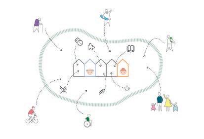Stambeni blok omogućuje modularnu organizaciju, potičući socijalnu raznolikost. Prizemlja uključuju trgovine i uslužne djelatnosti (kiosk, pekarnicu, ljekarnu, kafić). Vrtić i knjižnica imaju središnju ulogu u novom obrazovnom centru.