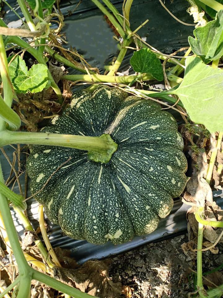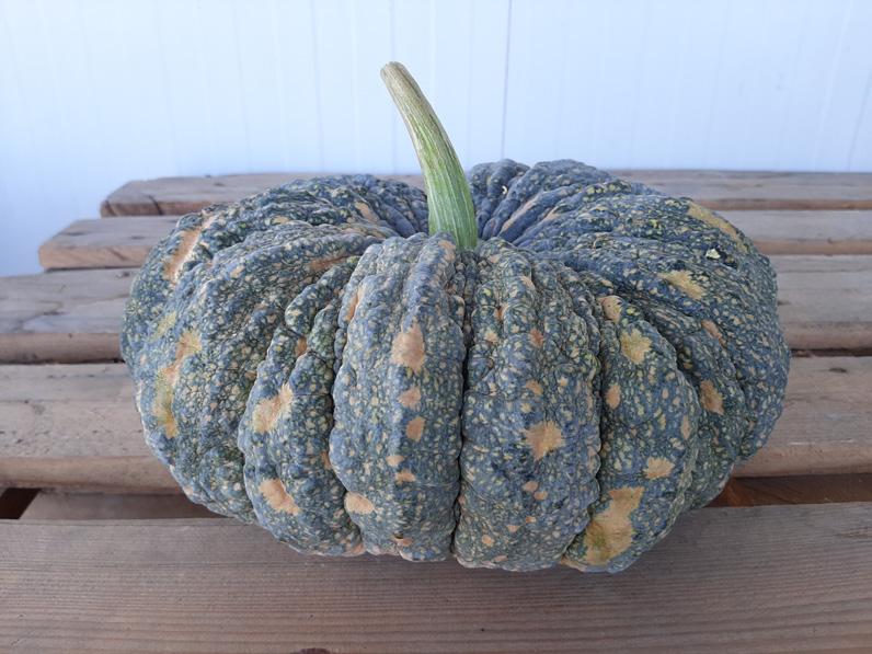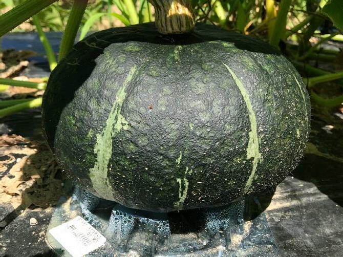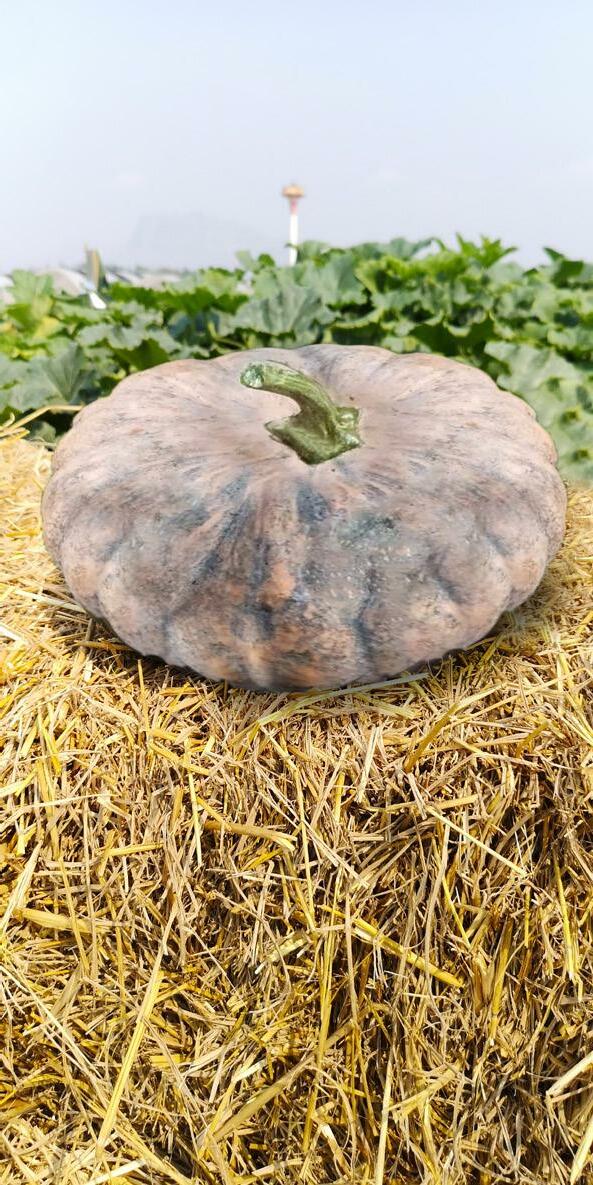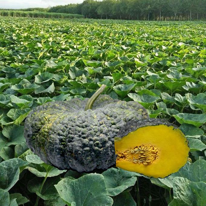 Oblate Fruit Shape, Dark Green Skin with Deep Yellow Flesh. Fruit weight 7-9 kg, Harversting 85-90 days after sowing. 03 PumpkinF1 (Cucurbita moschata Duchesne ex Poir)