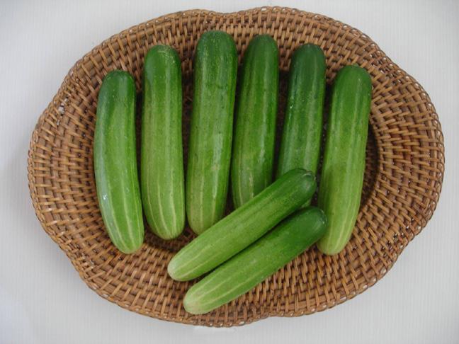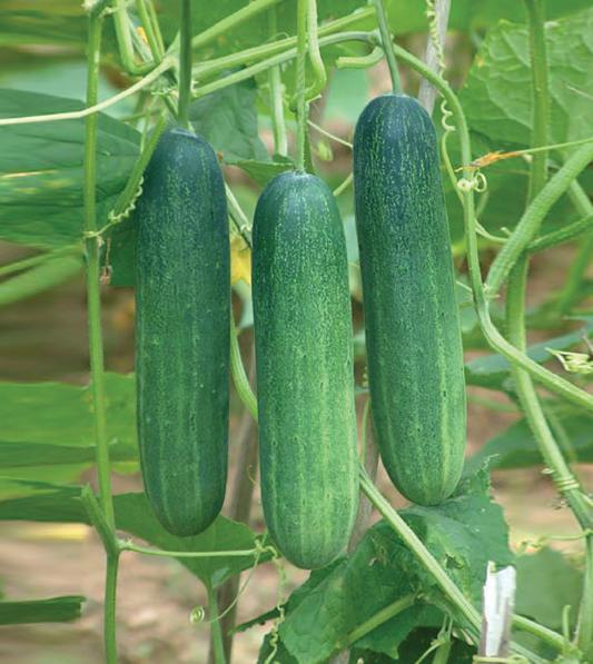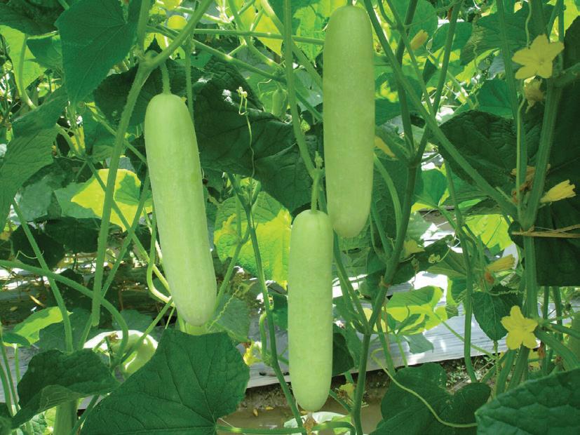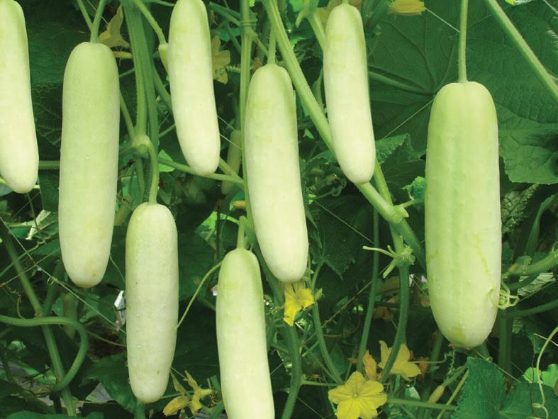 New Kongphibhop short cucumber Purpose : fresh Disease tolerance : downy mildew Variety Name Fruit size (cm.) Fruit weight (gm.) Harves t in g d ays (after/sowing) Yie ld ( fruits p e r plant) Yie ld ( kg. p e r plant) Yie ld ( ton per Ha) Spine co lo rFruit co lo r Sibsan 13-14 x 3-3.5 30-32 30-32 150-200 150-200 180-200 12-15 13-16 13-16 2.0-2.2 2.2-2.5 2.2-2.5 40-50 40-50 40-50 Dark Green White 16-18 x 4-4.5 White 18-20 x 4-4.5 33-35 33-35 200-250 180-220 15-20 2.0-2.5 50-57 42-45 White 18-20 x 4-4.5 33-35 33-35 200-250 200-250 10-15 10-15 10-15 1.7-2.0 1.7-2.0 1.5-1.8 45-50 45-50 Medium Green Medium Green Medium Green White 18-20 x 4-4.5 Dark Green Dark Green White 11-12 x 3-3.5 White 14-15 x 3-3.5 38-40 Deep Green WhiteSabai-Dee 77 Java Long cucumber Variety Name Fruit size (cm.) Fruit weight (gm.) Harves t in g d ays (after/sowing) Yie ld ( fruits p e r plant) Yie ld ( kg. p e r plant) Yie ld ( ton per Ha) Spine co lo rFruit co lo r Rassami 9 Rassami 1 Raja fruit color medium green Aechawee white cucumber Purpose : fresh Disease tolerance : downy mildew Variety Name Fruit size (cm.) Fruit weight (gm.) Harves t in g d ays (after/sowing) Yie ld ( fruits p e r plant) Yie ld ( kg. p e r plant) Yie ld ( ton per Ha) Spine co lo rFruit co lo r Porawee 12-15 x 3.6-3.8 33-35 38-40 100-140 150-160 180-200 15-20 17-25 13-18 1.5-2.0 1.8-2.5 1.7-2.0 35-45 42-50 42-50 White 17-19 x 3.8-4 White 16-18 x 4.5-4.8 30-35 White White White WhiteKotchasarn Purpose : fresh Disease tolerance : downy mildew long cucumberF1 (Cucumis sativus L.) Fruit s iz e Yie ld : ( t o n p e r H a ) 16-18 x 4.0-4.5 cm. 42-45 JAVA Medium green skin with tick flesh, high yield, early to harvest. Fruit size 16-18 cm. 15