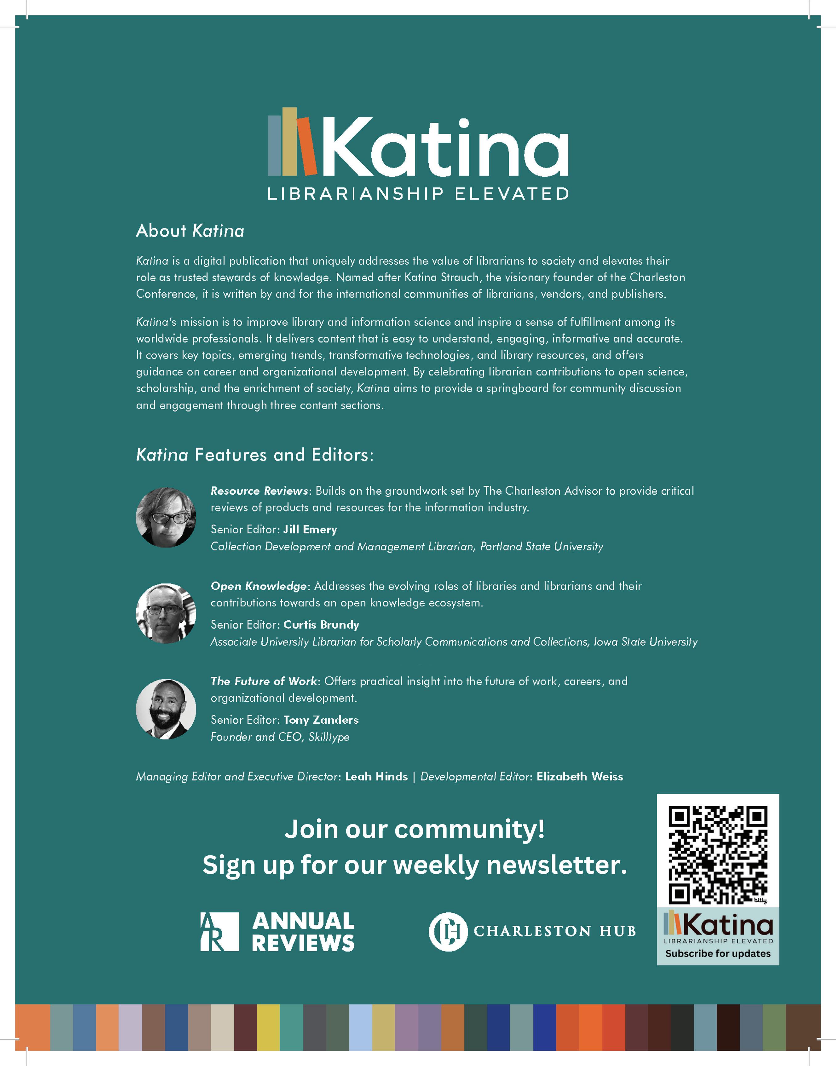 At the 2024 Charleston Conference, the Charleston Hub unveiled Katina, a new digital publication that addresses the value of librarians to society and elevates their role as trusted stewards of knowledge.