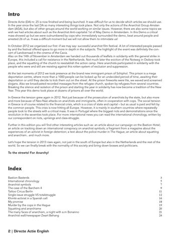Intro Directe Actie (DA) nr. 25 is now finished and being launched. It was difficult for us to decide which articles we should use. In the year since the last DA so many interesting things took place. Not only the actions of the Anarchist Group Amsterdam (AGA), but also of other groups around the world working on similar issues. However, there are also some topics we wish we had articles about such as the Anarchist Anti-capitalist 1st of May Demo in Amsterdam. In this Demo a critical mass showed up but we were outnumbered by cops who immediately surrounded the demo, beat around people and arrested 26 of us. It was a difficult moment but we will not allow them to intimidate us! In October 2012 we organized our first -if we may say- successful anarchist film festival. A lot of interested people passed by and the festival offered space to go more in depth in the subjects. The highlight of the event was definitely the concert of Landverraad in the cinema of the Cavia. Also on the 14th of November in Amsterdam we handed out thousands of leaflets in solidarity with the general strike in Europe, this included a call for resistance in the Netherlands. Not much later the eviction of the Notweg in Osdorp took place, and the squatting of the church to reestablish the action camp. Here anarchists participated in solidarity with the people who were and still are resisting against this rotten system of exclusion and suppression. At the last moments of 2012 we took presence at the brand new immigrant prison of Schiphol. This prison is a mega deportation centre, where more than a 1000 people can be locked up for an undecided period of time, awaiting their deportation or until they decide to kick them out on the street. At the prison fireworks were lite, we waved and screamed slogans. Also we broadcasted recorded messages from the refugee church, spoken by refugees from several countries. Breaking the silence and isolation of the prison and starting the year in solidarity has now become a tradition of the New Year. This year this demo took place at dozens of prisons all over the world. In Greece the tension grew again in 2012. Not just because of the prosecution of anarchists by the state, but also more and more because of Neo-Nazi attacks on anarchists and immigrants, often in cooperation with cops. The social tension in Greece is of course related to the financial crisis, which is a crisis of state and capital – but as usual is paid and felt by the common people. This crisis is now hitting all Europe. However, it is mainly in southern countries where repeatedly people took to the streets with a critical mass. It was in Portugal where the biggest riots and demonstrations since the revolution in the seventies took place. For more international news you can read the international chronology, written by our correspondent on riots, uprisings and class-struggle. Further in this edition you will find other interesting articles such as: an article about our campaign on the Bastion Hotel; an article on tracking down an international conspiracy on anarchist symbols; a fragment from a magazine about the experiences of an activist in foreign detention; a text about the police murder in The Hague; an article about squatting and anarchism.. and much more. Let’s hope the tension in 2013 rises again, not just in the south of Europe but also in the Netherlands and the rest of the world. So we can finally break with the normality of this society and bring down bosses and politicians.