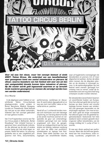 D.I.Y. anti-repressiefestival Voor mij was het nieuw, maar het concept bestaat al sinds 2007: Tattoo Circus. Als onderdeel van een benefietfestival voor gevangenen komt een aantal tatoeëerders en piercers bij elkaar, waarna bezoekers van het festival zich voor een (al dan niet vastgestelde) donatie kunnen laten tatoeëren of piercen. Op die manier wordt geld ingezameld waarmee er op verschillende manieren gevangenen en mensen die vervolgd worden kunnen worden ondersteund. Door Maartje In de afgelopen jaren hebben er verschillende Tattoo Circus-festivals plaatsgevonden, onder andere in Rome, Barcelona, Madrid, Zaragoza, Londen en Thessaloniki. Deze festivals zijn niet per se aan elkaar verbonden, iedereen kan het concept gebruiken en naar gelieve invullen. Van 7 tot 9 september vond er een Tattoo Circus plaats in Bethaniën, Berlijn Kreuzberg.* Het initiatief hiervoor is genomen door verschillende individuen die allemaal op de één of andere manier bezig zijn met strijd tegen repressie. Naast het tattoo- en piercinggedeelte was er een uitgebreid programma met films, documentaires,