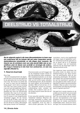 Twee visies Op de volgende pagina’s zijn twee discussieteksten te lezen over een onderwerp dat de laatste tijd wel vaker besproken wordt: deelstrijdversus totaalstrijd, en alle dingen daar tussenin. De theorie van de schrijvers over een vrije wereld blijkt niet zo verschillend, juist de ideeën over praktijk en strategie zijn anders. De vraag is hoeveel je in één keer kan aankaarten, en wat nou eigenlijk effectief is. 1. Totaal de draad kwijt Door Gup De term totaalstrijd heb ik de afgelopen tien jaar zo af en toe eens gehoord en de associaties die ik ermee heb zijn niet zo fijn. Als mensen me zeiden dat ze ‘vanaf nu meer met de totaalstrijd bezig gingen’ wist ik dat ze voorlopig niet meer naar acties zouden komen, maar wel naar de kraakkroeg. Relevanter voor dit artikel is het gebruik van dezelfde term door de Internationale Socialisten (IS), maar ik wil mijn pijlen niet op hen richten. Sinds een paar jaar hoor ik mensen in mijn omgeving weer ‘totaalstrijd’ zeggen. Dit zijn mensen die niet bij de IS zitten, maar ook niet van plan zijn hun progressieve strijd verder aan de bar te voeren. Wat bedoelt deze groep mensen met Totaalstrijd?
