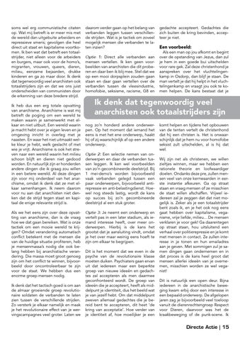 soms wel erg communistische citaten op. Wat mij betreft is er meer mis met de wereld dan uitgebuite arbeiders en repressieve smeris; gevolgen die heel direct uit staat en kapitalisme voortkomen. Ik ben wat dat betreft een totaalstrijder, niet alleen voor de arbeiders en burgers, maar ook voor de homo’s, migranten, vrouwen, queers, dieren, milieu, eenzame bejaarden, drukke kinderen en ga zo maar door. Ik denk dat tegenwoordig veel anarchisten ook totaalstrijders zijn en dat we ons juist onderscheiden van communisten door de erkenning van deze bredere strijd. Ik heb dus een erg totale opvatting van anarchisme. Anarchisme is wat mij betreft de poging om een wereld te maken waarin je samenwerkt met elkaar en niet uitbuit. Een wereld waarin je macht hebt over je eigen leven en je omgeving inricht in overleg met je naasten. En waar het niet uitmaakt welke kleur je hebt, welk geslacht of met wie je vrijt. Anarchisme is ook het streven naar een wereld waarin het milieu schoon blijft en dieren niet gedood worden. En natuurlijk zijn er honderden andere dingen die ik graag zou willen in een betere wereld. Al deze dingen zijn voor mij onderdeel van het anarchisme, omdat ik denk dat ze met elkaar samenhangen. Ik neem daarom voor nu aan dat anarchisten niet denken dat de strijd tegen staat en kapitaal de enige relevante strijd is. Als we het eens zijn over deze opvatting van anarchisme, dan is de vraag hoe we dat gaan bereiken. Wat is onze tactiek om een mooie wereld te krijgen? Omdat verandering automatisch conflict betekent met de mensen die van de huidige situatie profiteren, heb je mensenmassa’s nodig die ook belang hebben bij anarchistische verandering. Die massa moet groot genoeg zijn om het conflict te winnen, bijvoorbeeld door oncontroleerbaar te zijn voor de staat. We hebben dus een enorme groep mensen nodig. Ik denk dat het tactisch goed is om aan de almaar groeiende groep revolutionaire soldaten de verbanden te laten zien tussen de verschillende strijden. Zo versterk je elkaar namelijk en maak je het revolutionaire effect van je wervingscampagnes veel groter. Laten we