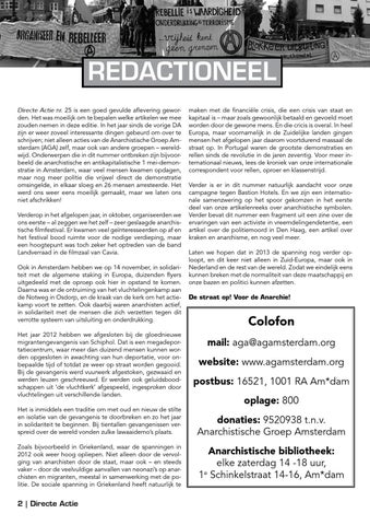 Redactioneel Directe Actie nr. 25 is een goed gevulde aflevering geworden. Het was moeilijk om te bepalen welke artikelen we mee zouden nemen in deze editie. In het jaar sinds de vorige DA zijn er weer zoveel interessante dingen gebeurd om over te schrijven; niet alleen acties van de Anarchistische Groep Amsterdam (AGA) zelf, maar ook van andere groepen – wereldwijd. Onderwerpen die in dit nummer ontbreken zijn bijvoorbeeld de anarchistische en antikapitalistische 1 mei-demonstratie in Amsterdam, waar veel mensen kwamen opdagen, maar nog meer politie die vrijwel direct de demonstratie omsingelde, in elkaar sloeg en 26 mensen arresteerde. Het werd ons weer eens moeilijk gemaakt, maar we laten ons niet afschrikken! Verderop in het afgelopen jaar, in oktober, organiseerden we ons eerste – al zeggen we het zelf – zeer geslaagde anarchistische filmfestival. Er kwamen veel geïnteresseerden op af en het festival bood ruimte voor de nodige verdieping, maar een hoogtepunt was toch zeker het optreden van de band Landverraad in de filmzaal van Cavia. Ook in Amsterdam hebben we op 14 november, in solidariteit met de algemene staking in Europa, duizenden flyers uitgedeeld met de oproep ook hier in opstand te komen. Daarna was er de ontruiming van het vluchtelingenkamp aan de Notweg in Osdorp, en de kraak van de kerk om het actiekamp voort te zetten. Ook daarbij waren anarchisten actief, in solidariteit met de mensen die zich verzetten tegen dit verrotte systeem van uitsluiting en onderdrukking. Het jaar 2012 hebben we afgesloten bij de gloednieuwe migrantengevangenis van Schiphol. Dat is een megadeportatiecentrum, waar meer dan duizend mensen kunnen worden opgesloten in awachting van hun deportatie, voor onbepaalde tijd of totdat ze weer op straat worden gegooid. Bij de gevangenis werd vuurwerk afgestoken, gezwaaid en werden leuzen geschreeuwd. Er werden ook geluidsboodschappen uit ‘de vluchtkerk’ afgespeeld, ingesproken door vluchtelingen uit verschillende landen. Het is inmiddels een traditie om met oud en nieuw de stilte en isolatie van de gevangenis te doorbreken en zo het jaar in solidariteit te beginnen. Bij tientallen gevangenissen verspreid over de wereld vonden zulke lawaaidemo’s plaats. Zoals bijvoorbeeld in Griekenland, waar de spanningen in 2012 ook weer hoog opliepen. Niet alleen door de vervolging van anarchisten door de staat, maar ook – en steeds vaker – door de veelvuldige aanvallen van neonazi’s op anarchisten en migranten, meestal in samenwerking met de politie. De sociale spanning in Griekenland heeft natuurlijk te