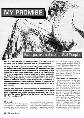 Excerpts from the zine ‘Still People’ This is an excerpt from the zine Still People that tells about one activist’s time in foreign detention here in the Netherlands. On July 5th 2011 roughly a hundred fifty people were arrested for refusing to follow a police order at the demonstration held at the eviction of the squat ‘Schijnheilig’ in Amsterdam. It was one of the largest mass arrests ever made in the Netherlands. All of the arrestees who could or would not produce an identity card at the police station were put into custody of the foreign police. During the following week most of the arrestees showed their ID’s and were released. Eight of them were transferred to the (euphemistically called) ‘detention centers’ of Zaandam and Rotterdam Zestienhoven, where they were imprisoned for up to two months. The zine Still People is a personal account of her experiences in foreign detention, both in Rotterdam Zestienhoven and of a previous experience with foreign detention elsewhere. The zine, illustrated by Helena Sanders, can be bought at the bookshop ‘Het Fort van Sjakoo.’[1] By Oona