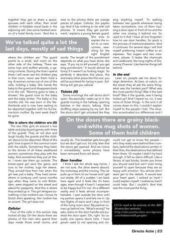 We’ve talked quite a lot the last days, mostly of sad things where the children are.’ The guard points to a small, dull room on the other side of the hallway. There are some toys and stuffed animals, a gaming console. During the time I spend there I will never see the children play in that room, never see them hold a toy. A woman comes out of one of the cells, holding a baby. She hands the baby to the guard and disappears back in to the cell. ‘Mommy goes to take a shower,’ the guard coos to the baby and the baby smiles. The baby is five months old. He was born in the Netherlands and is now here waiting to be deported together with his Suriname-born mother. By next week they’ll be gone. This is where the children are (II) The two little girls sit around a low table and play board games with three of the guards. They all roll dice and laugh loudly, the guards and the children about to be deported. Most of the girls’ time is spent in the common room with the adults. Sometimes they listen to the stories of all these weathered women; sometimes they play with the baby. And sometimes they just sit there. I never see them go outside. The brown-eyed girl wins the game and runs to her mother, tugs her sleeve. They arrived here from Iran when the girl was just a baby. They lived somewhere in Limburg until some months ago when they came to visit Rotterdam, were stopped on the street and asked for passports. And this is where they ended up in. The girl whispers something in her mother’s ear. I know it’s Dutch she’s speaking. Her mother has an accent. The girl does not.