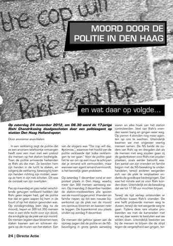 en wat daar op volgde… Op zaterdag 24 november 2012, om 06.30 werd de 17-jarige Rishi Chandrikasing doodgeschoten door een politieagent op station Den Haag Holland-spoor. Door anonieme anarchisten In een verklaring zegt de politie dat ze een anoniem telefoontje ontvangen heeft over een man met een pistool die mensen op het station bedreigde. Toen de politie arriveerde herkenden ze Rishi als die man. Ze bevolen hem zijn handen in de lucht te steken, en volgens de verklaring, bewoog hij toen zijn handen richting zijn middel, waarop ze hem in zijn nek schoten. Dit was de oorzaak van zijn overlijden. Pas op maandag en pas nadat verschillende getuigen verklaard hadden dat Rishi geen wapen had, gaf de politie toe dat er geen wapen bij hem in de buurt of op het station gevonden was. Op zondagmiddag (een dag na de moord), liepen er 300 tot 350 mensen mee in een stille tocht voor zijn dood, die eindigde op de plek van zijn moord. De mensen legden daar bloemen neer, staken kaarsen aan en schreven slogans op de muren van het station. Een