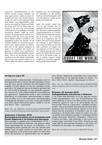 sche Gouden Dagenraad aangevallen door anarchisten en antifascisten in de volgende steden en dorpen: Irakleio, Volos, Xanthi, Agrinio, Aspropyrgos en Alimos. Meer info op: http://en.contrainfo.espiv.net/2012/12/09/ athens-explosive-attack-at-chrissi-avgi-golden-dawn-offices/. Duitsland, 22 december 2012 Antikapitalistische demonstratie in Duitsland In de Duitse stad Mannheim is er die dag een demonstratie georganiseerd door het Anarchistisches Netzwerk Südwest. Er lopen ruim 600 mensen uit het anarchistische spectrum mee in de demonstratie die het thema heeft ‘There is no alternative – Kapitalismus Überwinden’. Het is de tweede demonstratie die word georganiseerd door het anarchistisch netwerk en het is opvallend dat het anarchisme in Duitsland meer en meer aanwezig is. Dit heeft onder andere te maken met nieuwe actieve anarchistische groepen in verschilden Duitse steden waaronder Karlsruhe, Düsseldorf, Freiburg en Frankfurt am Main, vaak verbonden in het Forum deutschsprachiger Anarchist*innen (FdA). Ondanks de vele regen blijft de demonstratie strijdbaar en zijn korte confrontaties met de politie, die massaal op de been is. Meer info op: http://a-netz.org/ en http://fda-ifa.org/.