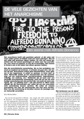 Hoe die anarchistische samenleving, die na het verdwijnen van staat en kapitaal zal ontstaan, er precies uit gaat zien, dat weten wij niet. Anarchisten maken geen blauwdrukken, maar geloven in het experiment, in vallen en opstaan, in leren door te doen. Natuurlijk stellen zij wel voorwaarden aan die samenleving: vrij van onderdrukking, non-hiërarchisch, federalistisch, vrijwillig, van onderop, etc.. Voldoende zijn zij nooit voor een werkelijk anarchistische samenleving, want die zal net als onze huidige samenleving ook niet perfect zijn; net zoals de mens overigens, die – en gelukkig maar – ook niet perfect is. Maar noodzakelijk zijn die voorwaarden wel, willen wij van een anarchistische samenleving kunnen spreken. Nu zullen de meeste anarchisten het over die voorwaarden wel snel eens worden. Over hoe die samenleving te bereiken kunnen de meningen echter behoorlijk verschillen. Het herkennen van de vijand Door Michael Bikini Een van die vele gezichten is Alfredo M. Bonanno, een vertegenwoordiger van het zogenaamde insurrectionalisme, over wie talloze verhalen de ronde doen. Op maandag 10 december was hij in Amsterdam en sprak daar voor zo’n veertig mensen. Bonanno, een net uitziend Italiaans heertje op leef-