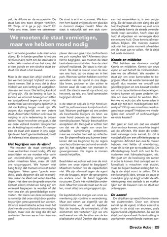 plexer dan een glas. Hoe confronteren we zo’n complex iets? Allereerst door het te begrijpen. We moeten de staat bestuderen en uitvinden hoe de staat zichzelf realiseert. De staat is niet abstract. De staat is overal: voor de deur van ons huis, op de stoep en in het park. Wanneer we het hebben over het aanvallen van de vijand in ons dagelijks leven, probeer er dan achter te komen waar de staat zich precies bevindt. De staat is overal: op school, op het werk, op reis, etc. Veel kameraden begrijpen dit niet. Is de staat er ook als ik mijn hond uitlaat? Ja, zelfs wanneer ik mijn hond uitlaat. Waarom gedragen wij ons anders als beschaafde burgers en laten we onze hond poepen op daarvoor bestemde plaatsen. Wij zijn beschaafd en accepteren dit. Het gaat er echter niet om dat we de regels van onze beschaafde samenleving ontkennen, maar we moeten hier wel op reflecteren. En deze reflectie zou kunnen betekenen dat we beginnen bij de regels voor het uitlaten van de hond en eindigen bij het opsluiten van mensen in gevangenissen. De logica is immers steeds hetzelfde. Beschikken wij echter wel over de middelen om onze vijand te begrijpen? Misschien hebben we de capaciteiten niet. We zijn allemaal tegen de agent met de knuppel, tegen de gevangenis en andere voor de hand liggende structuren. Dat is het makkelijke onderdeel. Maar het idee de staat aan te vallen, moet altijd ons uitgangspunt zijn. De kapitalistische marges van onze samenleving zijn continu in verandering. Maar wat weten we eigenlijk van de transformatie van staat en kapitaal. Wat de kranten, de universiteit, of de economen ons vertellen? Zijn we ons wel bewust van alle facetten van de kapitalistische crisis? Denken dat de staat