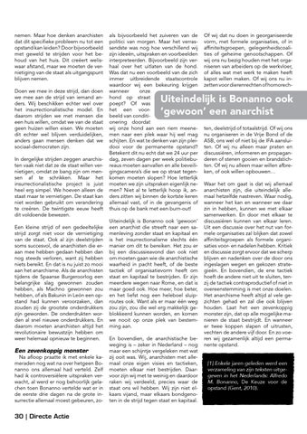 ten, deelstrijd of totaalstrijd. Of wij ons nu organiseren in de Vrije Bond of de ASB, ons wel of niet bij de IFA aansluiten. Of wij nu alleen maar praten en discussiëren, informeren en propaganderen of stenen gooien en brandstichten. Of wij nu alleen maar willen afbreken, of ook willen opbouwen… Waar het om gaat is dat wij allemaal anarchisten zijn, die uiteindelijk allemaal hetzelfde nastreven. Waar nodig, wanneer het kan en wanneer we daar zin in hebben, kunnen we met elkaar samenwerken. En door met elkaar te discussiëren kunnen van elkaar leren. Uit een discussie over het nut van formele organisaties zal blijken dat zowel affiniteitsgroepen als formele organisaties voor- en nadelen hebben. Kritiek en discussie zorgt ervoor dat we scherp blijven en nadenken over de door ons ingeslagen wegen en gekozen strategieën. En bovendien, de ene tactiek hoeft de andere niet uit te sluiten, tenzij de tactiek contraproductief of niet in overeenstemming is met onze doelen. Het anarchisme heeft altijd al vele gezichten gehad en zal die ook blijven houden. Laat het een zevenkoppig monster zijn, dat op alle mogelijke manieren de staat bestrijdt. En wanneer er twee koppen slapen of uitrusten, vechten de andere vijf door. En zo voeren wij gezamenlijk altijd een permanente opstand. [1] Enkele jaren geleden werd een verzameling van zijn teksten uitgegeven in het Nederlands: Alfredo M. Bonanno, De Keuze voor de opstand (Gent, 2010).