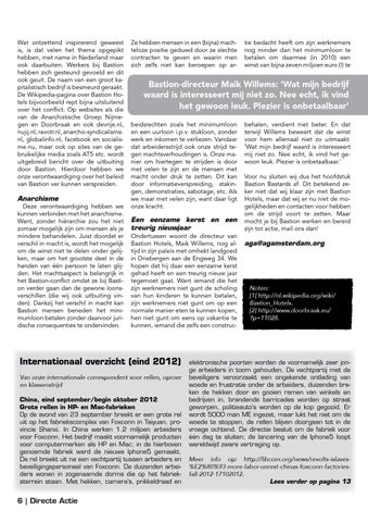 elektronische poorten worden de voornamelijk zeer jonge arbeiders in toom gehouden. De vechtpartij met de beveiligers veroorzaakt een ongekende ontlading van woede en frustratie onder de arbeiders, duizenden breken de hekken door en gooien ramen van winkels en bedrijven in, brandende barricades worden op straat geworpen, politieauto’s worden op de kop gegooid. Er wordt 5000 man ME ingezet, maar lukt het niet om de woede te stoppen, de rellen blijven doorgaan tot in de vroege ochtend. De directie besluit om de fabriek voor één dag te sluiten; de lancering van de Iphone5 loopt wereldwijd zware vertraging op. Meer info op: http://libcom.org/news/revolts-islaves%E2%80%93-more-labor-unrest-chinas-foxconn-factoriesfall-2012-17102012. Lees verder op pagina 13