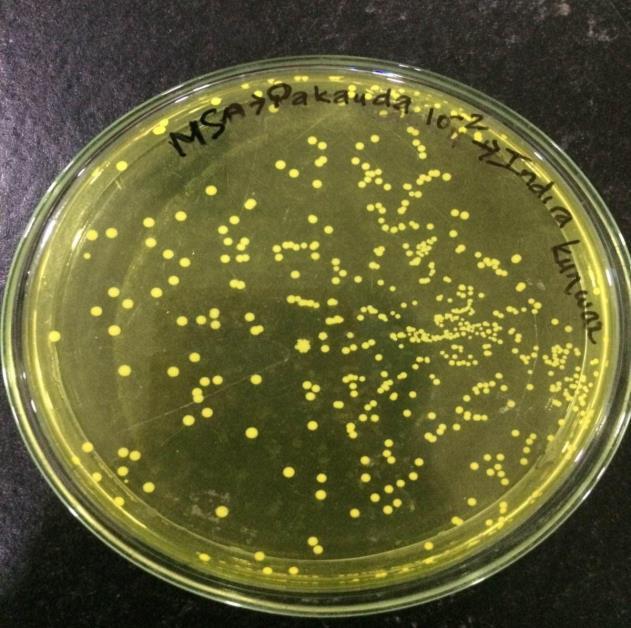 About 0.1 ml homogeneous sample from 10-1 was aseptically transferred onto the surface of sterile mannitol salt agar media plates and sample was spread all over the plates using a sterile bent glass rod. Then plates were incubated for 24 to 36 hours at 37° C and the plates were examined for S aureus which appeared as small circular and smooth with a shiny surface and golden yellow color. The isolated organism was picked up andsubcultured on the nutrient agar medium plate and incubated at 37°C for 24 hours. After obtaining pure culture, the organism was identified on the basis of its morphological characteristics, Gram staining, and biochemical properties (Akter, 2016).