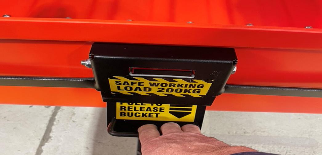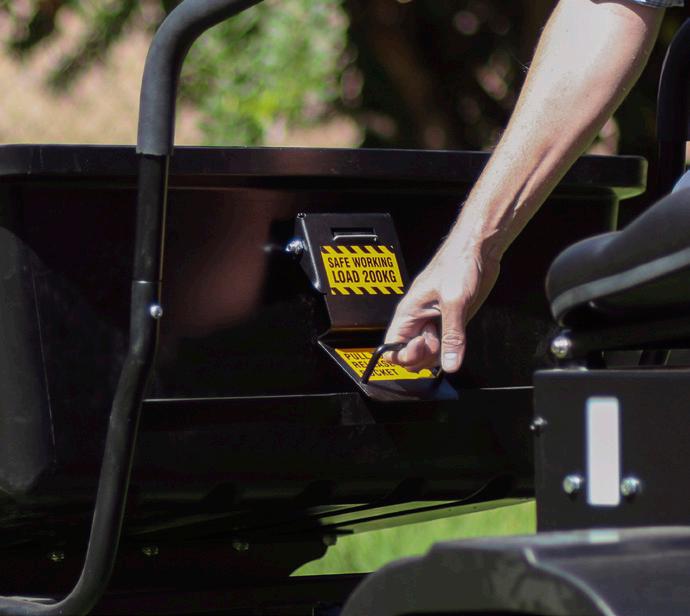 TIPPING THE TUB: When the tub has been emptied, lower the tub whilst holding the latch outward (towards the rear of the unit) to ensure it goes over the engagement bar. Make sure the latch fits firmly under the bar so that the tub does not lower while driving