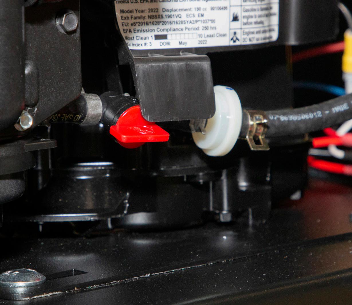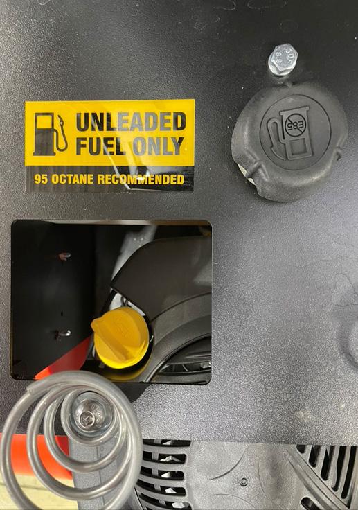 FUEL TAP: The red tap on the right hand side of the engine is the fuel tap. It is “ON” when it is horizontal and “OFF” when vertical. Always turn tap to the off position for transportation to avoid flooding. It is advisable to turn the tap to the “OFF” position if there are no plans to use the RAT Barrow for an extended period of time and allow the motor to run out of fuel. Fuel should not be kept for any more than 90 days