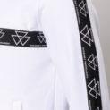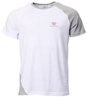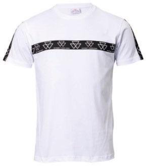 White crew neck T-shirt. The Massey Ferguson logo is printed on a black stripe down the middle of the chest and on the sleeves.