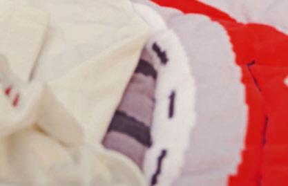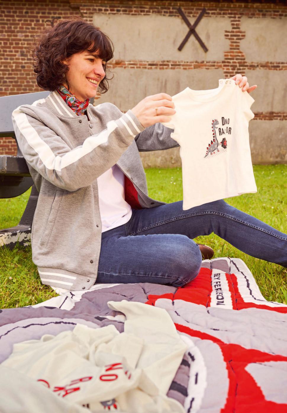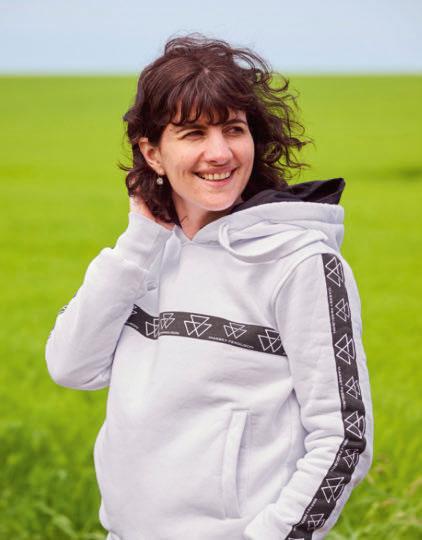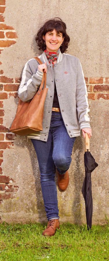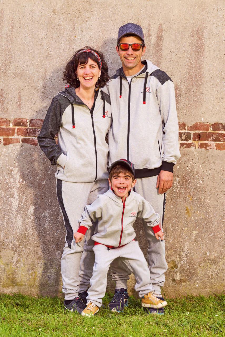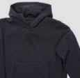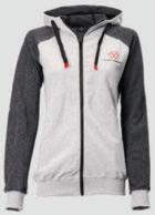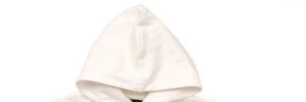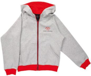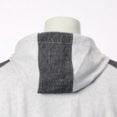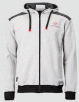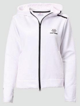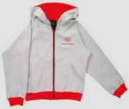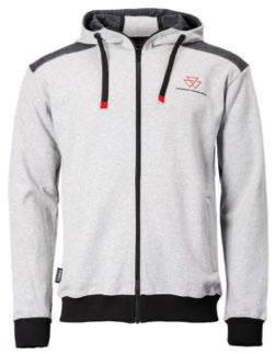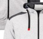 Jacket in thick sweatshirt material, closed with a zip and white stitching lines on the sleeves and hood.