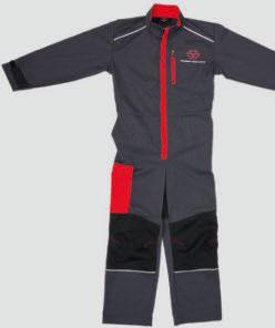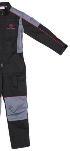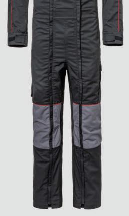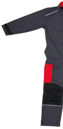 PROWEAR overall double zip suit: two zips from collar to lower leg, one breast pocket with zip, one pen pocket on left sleeve, one front pocket with access to inside pockets, leg pocket with velcro, back pocket with velcro, elasticated waistband, belt loops and tool loop, cuffs with velcro attachment, refective piping. Material: 65% polyester, 35% cotton 250 g/m².