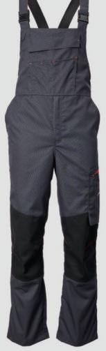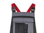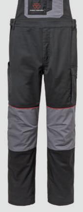 PROWEAR work overalls: ribbed knit on the sides for more comfort, short front zip, large breast pocket, pen pocket, side pocket, leg pocket with zip, back pocket with velcro, rubber band on back waist, adjustable braces. Material: 65% polyester, 35% cotton 245 g/m²