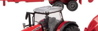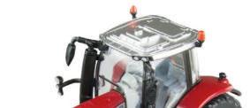 The new Massey Ferguson 5 Series tractor features the new MF design, introduced on the popular 8S and recognisable by its grey ‚SABRE‘ stripe. This replica of that model has all the details that made the original so successful. The engine bonnet has a sharp, descending shape and the headlights are banded. The front and rear 3-point hitches are functional, as are the steering and the mirrors are removable. The new cab is very detailed and the dials are present on the dashboard, the armrest groups all the controls and the levers and screens are also present.