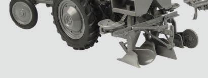 Re-edition: The MF 3080, of which more than 11,000 tractors were produced between 1986 and 1992, was the frst “smart” tractor to feature onboard electronics with Autotronic and Datatronic systems. The Datatronic version shown here is equipped with four-wheel drive, complete with fnely reproduced rims, wheels, front axle and drive shaft. The steering is functional, as is the three-point linkage. The perforated steps are fnely engraved, and inside the cab you can see all the levers, dials, pedals and the MF logo on the steering wheel. The rails, mirror supports and additional lights are painted.