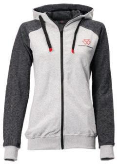 Wonen‘s hoodless feece jacket is made of a polyester and feece blend. It has asymmetric inserts in a contrasting fabric.