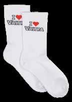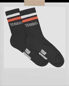 Calze sportive nere con strisce bianche e rosse intrecciate e il logo Valtra sul lato. La suola è realizzata con una maglia di spugna più spessa, compreso il testo. Materiale 80% cotone, 15% poliammide, 5% elastan.