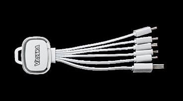 Un caricabatterie, più dispositivi! Include i seguenti connettori: 1 x USB, 1 x Micro-USB, 2 x Tipo-C, 1 x Apple Lightning e 1 x Mini-USB. Una luce bianca intorno alla custodia del caricabatterie indica che il dispositivo è in carica. La luce si spegne quando il dispositivo è scollegato.