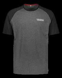 La T-shirt da uomo color grigio scuro ha maniche Raglan nere. Logo bianco stampato sul petto e la scritta Work Smart. Live More. stampata sulla manica destra. Il corpo della maglietta grigio scuro è realizzato in cotone riciciato 50% e in pollestere riciciato 50%, le maniche sono in cotone riciciato 100%.