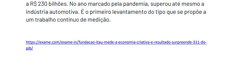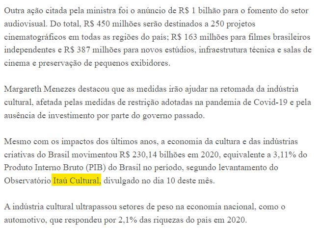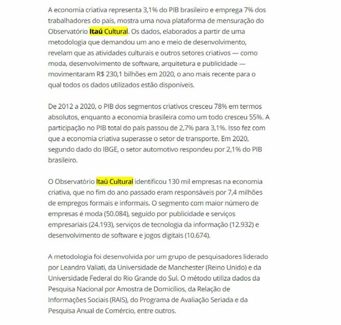 O estudo do Observatório Itaú Cultural mostrou que a Cultura e as Indústrias Criativas são de fato segmento de grade potência na economia brasileira. O segmento respondeu por 3,11% do PIB país em 2020.