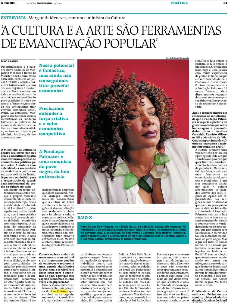 Cliente: Itaú Cultural Veículo: A Tarde - BA Data: 24/07/2023 Página: B1 Seção: Política