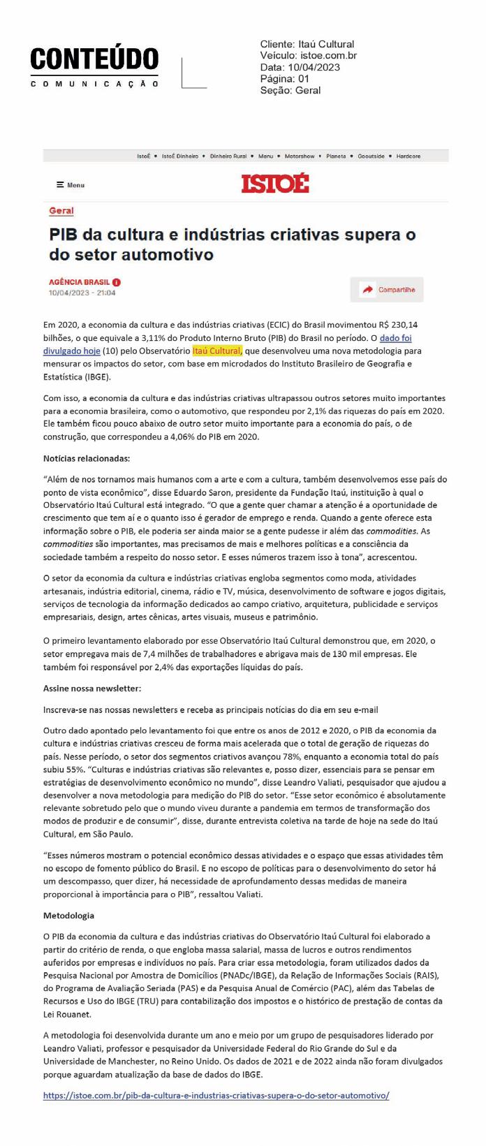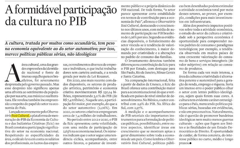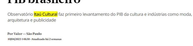 Entre abril (data do anúncio) e agosto deste ano, os dados PIB da Cultura e das Indústrias Criativas do Observatório Itaú Cultural conquistou 420 inserções na mídia. Foram 340 inserções no