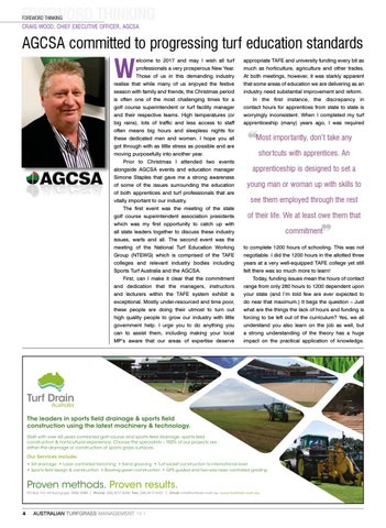 elcome to 2017 and may I wish all turf professionals a very prosperous New Year. Those of us in this demanding industry realise that while many of us enjoyed the festive season with family and friends, the Christmas period is often one of the most challenging times for a golf course superintendent or turf facility manager and their respective teams. High temperatures (or big rains), lots of traffic and less access to staff often means big hours and sleepless nights for these dedicated men and women. I hope you all got through with as little stress as possible and are moving purposefully into another year. Prior to Christmas I attended two events alongside AGCSA events and education manager Simone Staples that gave me a strong awareness of some of the issues surrounding the education of both apprentices and turf professionals that are vitally important to our industry. The first event was the meeting of the state golf course superintendent association presidents which was my first opportunity to catch up with all state leaders together to discuss these industry issues, warts and all. The second event was the meeting of the National Turf Education Working Group (NTEWG) which is comprised of the TAFE colleges and relevant industry bodies including Sports Turf Australia and the AGCSA. First, can I make it clear that the commitment and dedication that the managers, instructors and lecturers within the TAFE system exhibit is exceptional. Mostly under-resourced and time poor, these people are doing their utmost to turn out high quality people to grow our industry with little government help. I urge you to do anything you can to assist them, including making your local MP’s aware that our areas of expertise deserve