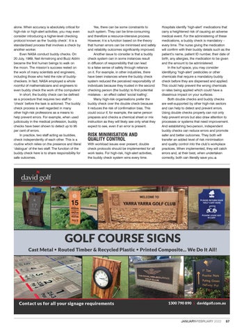 ADVERTORIAL alone. When accuracy is absolutely critical for high-risk or high-alert activities, you may even consider introducing a higher-level checking protocol known as the ‘buddy check’. It is a standardised process that involves a check by another worker. Even NASA conduct buddy checks. On 20 July, 1969, Neil Armstrong and Buzz Aldrin became the first human beings to walk on the moon. The mission’s success rested on the work of many scientists and engineers, including those who held the role of buddycheckers. In fact, NASA employed a whole roomful of mathematicians and engineers to even buddy check the work of the computers! In short, the buddy check can be defined as a procedure that requires two staff to ‘check’ before the task is actioned. The buddy check process is well regarded in many other high-risk professions as a means to help prevent errors. For example, when used judiciously in the medical profession, buddy checks have been shown to detect up to 95 per cent of errors. In practice, two staff acting as buddies, check independently of each other. This is a routine which relies on the presence and literal ‘dialogue’ of the two staff. The function of the buddy check here is to share responsibility for safe outcomes.
