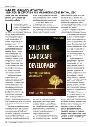 that covers site investigation, preparatory soil works, soil specifications for several horticultural applications including lawns, sportsfields, gardens and roof top gardens and soils for biofiltration and wetlands. There are also specifications for quality control, hold points, witness points and compliance certification which are so important in managing landscape projects.
