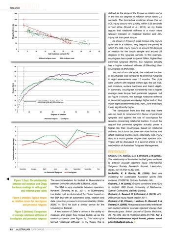 Chivers, I. H., Aldous, D. E. & Orchard, J. W. (2005). The relationship of Australian football grass surfaces to anterior cruciate ligament injury. International Turfgrass Society Research Journal, Llandudno, Wales, Vol 10 (Part 1) 327-332. McAuliffe, K. & Roche, M. (2009). Best use modelling for sustainable Australian sports field surfaces. (TU06019). Sydney, Australia: HAL. Orchard, J. W. (2005). Ground conditions and injury in football. (MD thesis, University of Melbourne, Special Collections, Bailleau Library). Orchard, J., Seward, H. & Orchard, J. (2012). AFL: 20th annual injury report season 2011. Orchard, J. W., Chivers, I., Aldous, D., Bennell, K. & Seward, H. (2005). Rye grass is associated with fewer non-contact anterior cruciate ligament injuries than Bermuda grass. British Journal of Sports Medicine, 39, 704-709. doi:10.1136/bjsm.2004.017756. For a full list of references in pdf format, please email p.ford@ballarat.edu.au