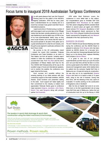 t is with great pleasure that I pen this Foreword Thinking piece for this edition of the AGCSA’s flagship publication. ATM has for many years been a standard-bearer for our industry and on a recent trip overseas it was great to see that it has an international presence. I spent some time in Florida touring a number of golf clubs eager to pick up some tips on the TifEagle variety that has been recently planted at my club. It was heartening to see the latest copy of ATM on two of my host superintendents’ desks; okay, so they were ex-pat Aussies, but it shows that the reach of the journal spreads to all parts of the globe and is a great advertisement for what the turf industry, and the golf course segment in particular, achieves in the land ‘Down Under’. My journey to the US unfortunately meant I missed the recent 33rd Australian Turfgrass Conference and Trade Exhibition on its return to Twin Waters, but from all reports I certainly wasn’t needed to make the conference the outstanding success that it was. From Troy Muir and his crew’s presentation of Pelican Waters Golf Club for the Toro AGCSA Golf Championship all the way to the excellent range of local and international speakers, not to mention the weather, the conference once again ticked all the boxes. Such success isn’t possible without the amazing backing of our trade partners with their unwavering support of the trade exhibition, AGCSA Awards, social functions and presenters adding to the week. Such support isn’t taken lightly and their commitment to the industry is indeed most appreciated. Particular thanks goes to conference major sponsors Amgrow, Jacobsen, John Deere, Nuturf, Toro and Syngenta along with principal partner Golf Australia.