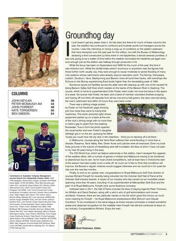 Contributors to Australian Turfgrass Management Journal Volume 24.5 (September-October 2022): 2022 FTMI delegates; Adobe Stock Images; Australian Golf Media; Shane Baker, CSTM (GCSAWA); Oliver Bell (Dunsborough Lakes GC); Lisa Burley (Royal Sydney GC); Brenton Clarke (Warrnambool GC); Garth Cusick (Eastern Sward GC); Evergreen Turf (NSW); John Forrest (Forrest and Forrest Horticultural Consultancy Services); Brooke Francis (Adelaide Oval); Getty Images; Ben Gibson (The Toolbox Team); Monina Gilbey (Glenelg GC); Leon Hennessy (NSWGCSA); Damian Hough (Adelaide Oval); Joel Ives (Green Options/ Kardinia Park); Liam Kirkman (Green Options/Kardinia Park); Scott Lardner (Cricket Australia); Shaun Lehane (Eastern Sward GC); Tristan Lintern (Adelaide Oval SMA); Peter McMaugh AM (Turfgrass Scientific Services); Melissa Mills (Hawks Nest GC); John Neylan (Sporteng); Marcus Pamplin (Blundstone Arena); Jason Perkins (NZGCSA); Fiona PringleJones (Pembroke School); Peter Roach (Cricket Australia); Jayde Robson (City of Ballarat); Simon Snedden (ACTSTMA); Simone Staples (ASTMA); Yolanda Sulser (Adelaide Oval SMA); Kate Torgersen (Environmental Golf Solutions); Mark Unwin (ASTMA); Sophie Warren (Glenelg GC); Tim Warren, CSTM (Glenelg GC).