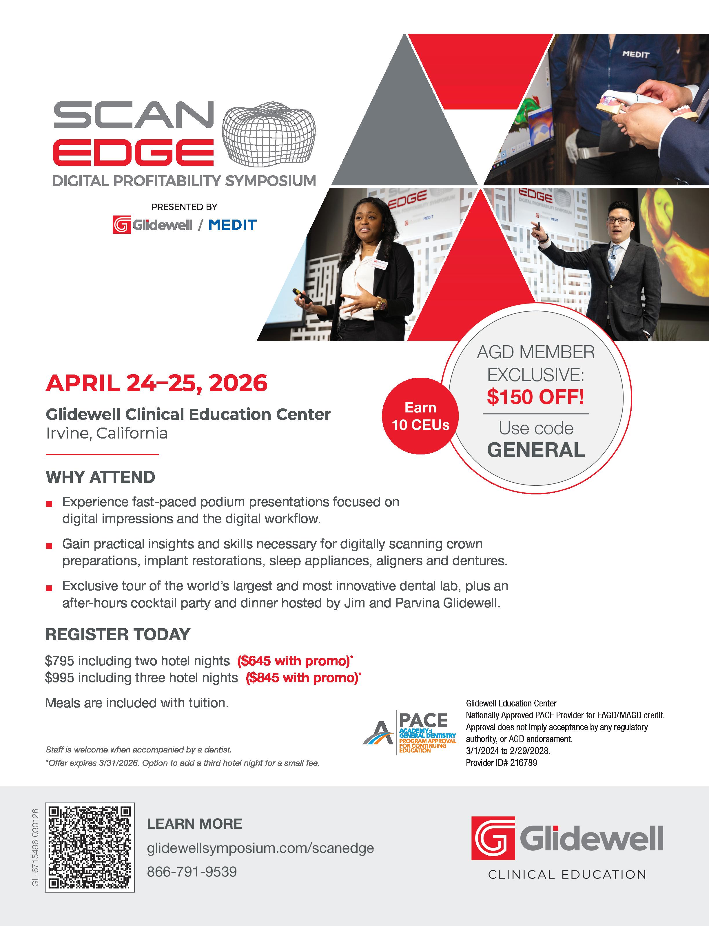 POSTMASTER: Send address changes to AGD Impact 560 W. Lake St., Sixth Floor, Chicago, IL 60661-6600. No portion of AGD Impact may be reproduced in any form without prior written permission from the AGD. Photocopying Information: The Item-Fee Code for this publication indicates that authorization to photocopy items for internal or personal use is granted by the copyright holder for libraries and other users registered with the Copyright Clearance Center (CCC). The appropriate remittance of $3 per article/10¢ per page is paid directly to the CCC, Inc., 222 Rosewood Drive, Danvers, MA 01923, USA. The copyright owner’s consent does not extend to copying for general distribution, for promotion, for creating new works, or for re-sale. Specific written permission must be obtained from the publisher for such copying. The Item-Fee Code for this publication is 0194-729X. Printed in U.S.A. © Copyright 2026, Academy of General Dentistry, Chicago, IL. AGD Corporate Sponsors
