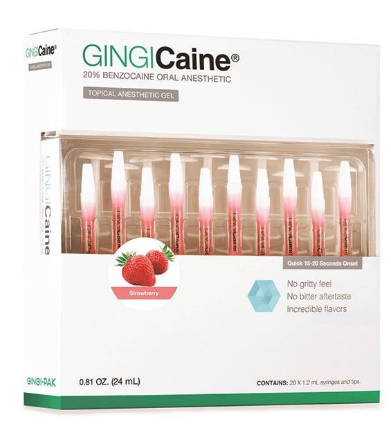 During a standard hygiene visit, supra- and subgingival calculus are often eliminated without major concern from the patient. However, sometimes a patient’s poor hygiene has led to enough irritation so that they cannot easily tolerate scaling without additional help. In some states, hygienists can earn certification to administer infiltration local anesthesia, but not all individuals are interested in advanced procedures. For the uncomfortable patient, topical anesthesia delivery can be extremely helpful and does not require additional certification. Among the most effective delivery systems I have found for topical anesthesia delivery at and below the sulcular peak is GINGICaine® from Gingi-Pak®. Instead of painting topical benzocaine with a brush or swab, this system utilizes a narrowtipped syringe that can inject the 20% benzocaine formula directly into the sulcus up to depths of seven millimeters without tearing. Within 20 seconds, the product delivers profound gingival anesthesia, and your hygienist can achieve the majority of their care without needing your time or intervention until final check time. If you want to take your topical anesthesia one step further, you also could try out an additional 2% hemp infusion for decreased inflammation with GINGICaine Infusion. Either way, the Gingi-Pak family of products, and GINGICaine in particular, is a worthwhile addition to your topical anesthesia protocols.