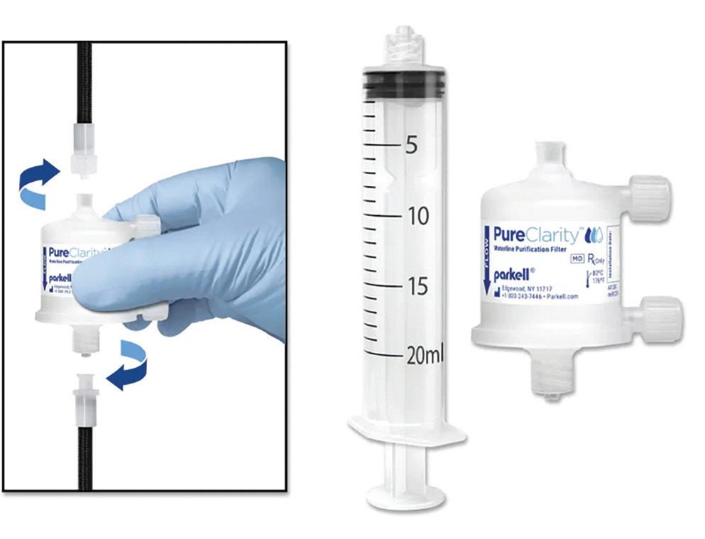 Like sterilization, a critical but somewhat invisible process that significantly impacts the cleanliness of your patient care system is waterline management. A simple product for maintenance of waterlines that run directly to ultrasonic hygiene scalers, like the Parkell™ TurboVue®, is the Parkell PureClarity™ Scaler Waterline Purification System. Using a simple Luer-lock system, it can be added onto existing waterlines and will eliminate all bacterial passthrough for up to six months. While I’m sure you test your water on a regular basis and have filtration for your whole office for lines coming from municipal sources, this last gate-keeping mechanism ensures that water is clean when it is used in a patient’s mouth. First shock the waterline and flush it, then attach the PureClarity filter. If you want to use it for the full lifetime of the filter, you should install it downstream from a sediment trap, such as the Parkell Sediment Water Filter. The Parkell system is simple to use and an easy way to guarantee patient safety.