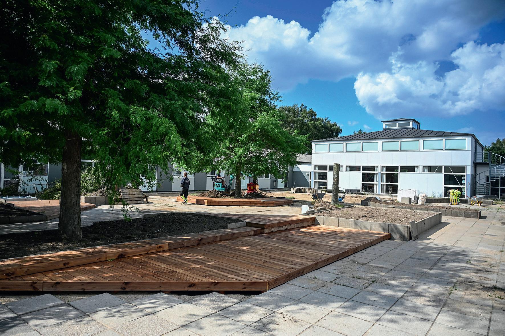 Der var travlhed i skolegården lige inden de mere end 400 elever mødte ind efter sommerferien. Skolegården har simpelthen fået ny asfaltbelægning, der er lagt nye fliser ved SFO’en, og den lyseblå bygning har fået ny maling. Grønnegården har haft besøg af en anlægsgartner, og i løbet af den seneste tid er der oprettet et såkaldt „kreativt centrum“ med nyt håndværk/design-lokale inde i skolens midte (som ganske vist ikke er helt færdigt), der er lavet have-/terrassedøre, og øvrige udeområder er blevet opgraderet.