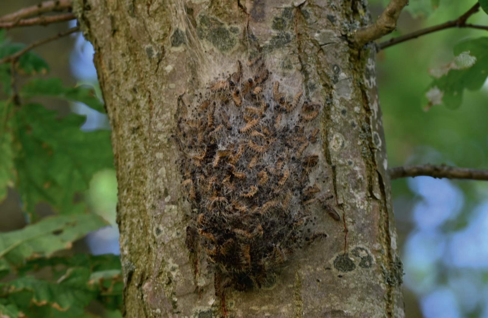 På tur med Agedrup Gå-Fællesskab opdagede Stig Poulsen en klump af de upopulære egeprocessionsspinderlarver på et egetræ mellem Markhaven og Lundsgaard.