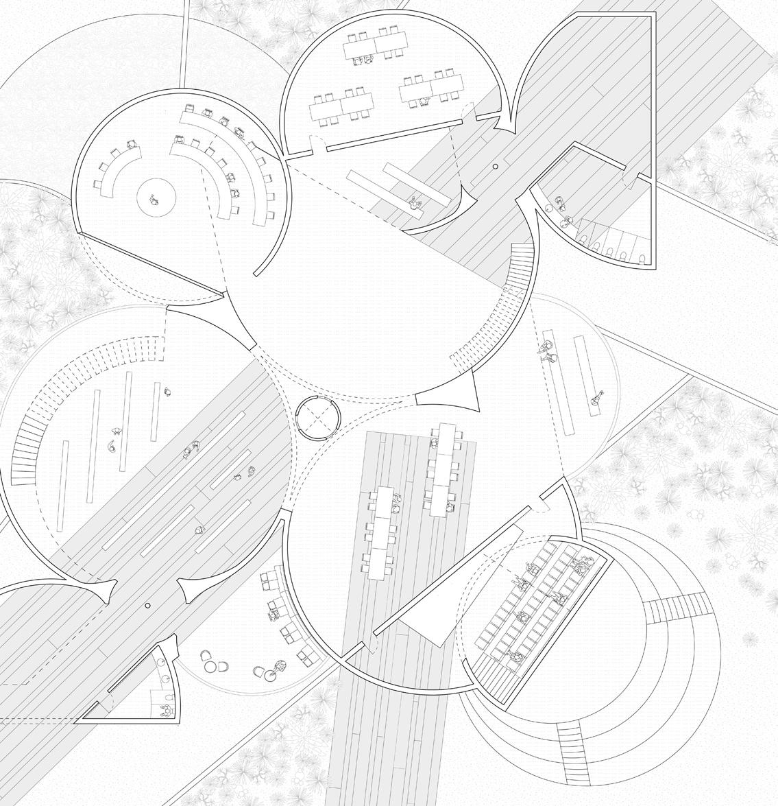 The drawing showcases the entrance of the building and how the exterior shape of the building begins to influence and for the space with. Some of the spaces include the interior park extention, art gallery, and cafe.